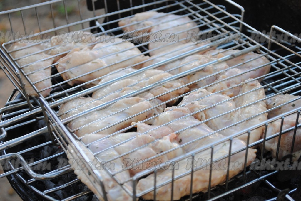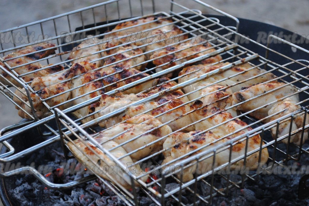 Жарить шашлык из куриных крылышек на мангале над горячими углями около получаса (до красивой румяной корочки), периодически переворачивая.
