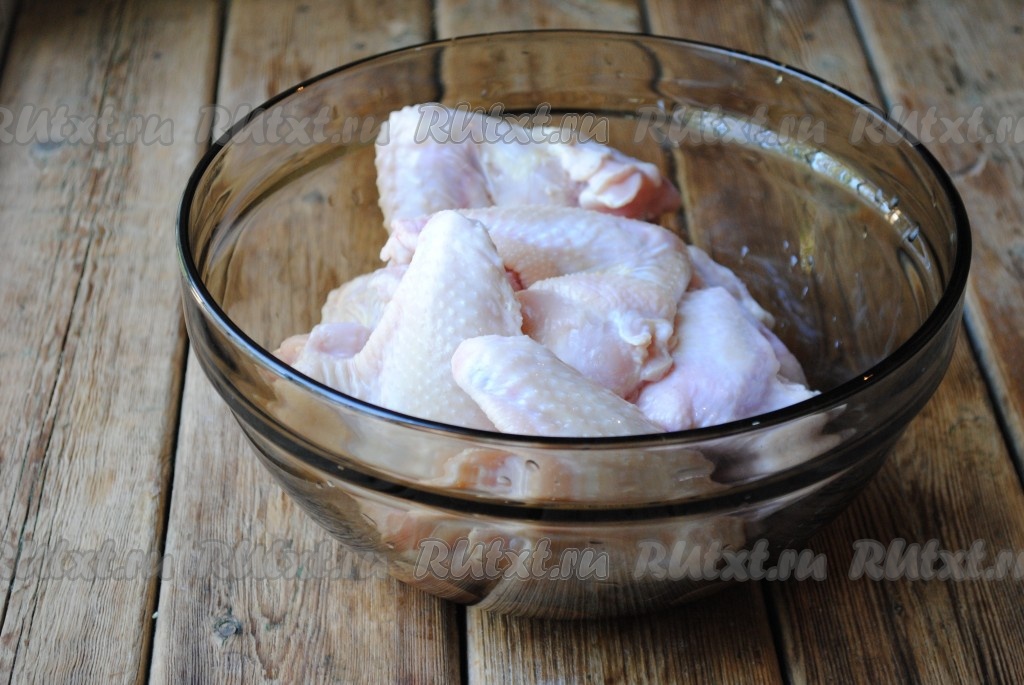 Куриные крылышки хорошо вымыть и обсушить. Выложить крылышки в подходящую миску, в которой будем мариновать шашлык.