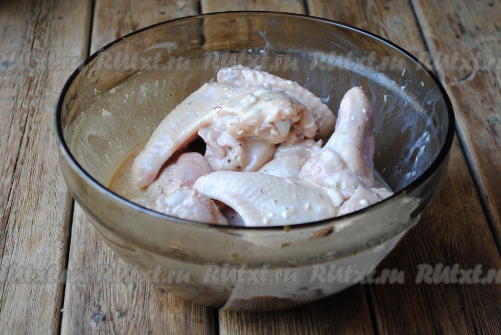Маринад вылить к куриным крылышкам и перемешать, чтобы маринад равномерно покрыл все кусочки и мясо хорошо промариновалось. Накрыть миску крышкой и поставить на 2-3 часа в холодильник.