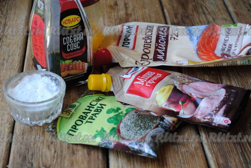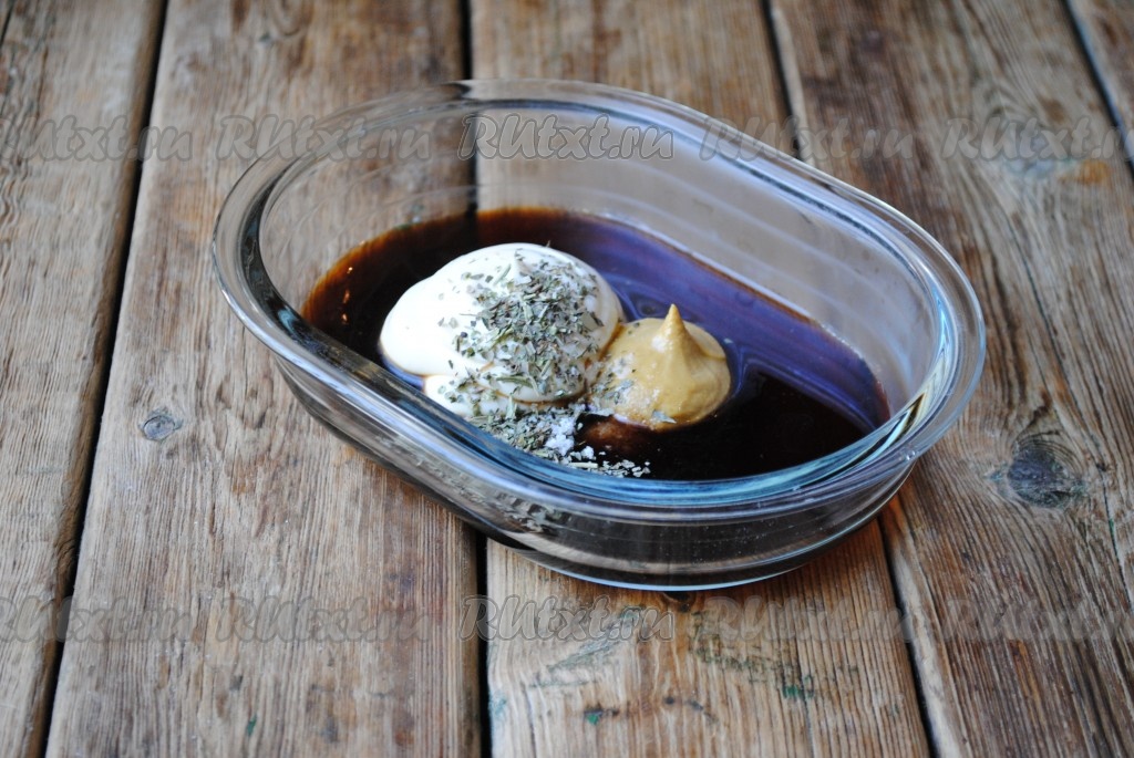 Для приготовления маринада соединить соевый соус, майонез, горчицу и мёд, добавить прованские травы и щепотку соли, хорошо перемешать. Соль добавляйте аккуратно, так как соевый соус, используемый для маринада, достаточно солёный.