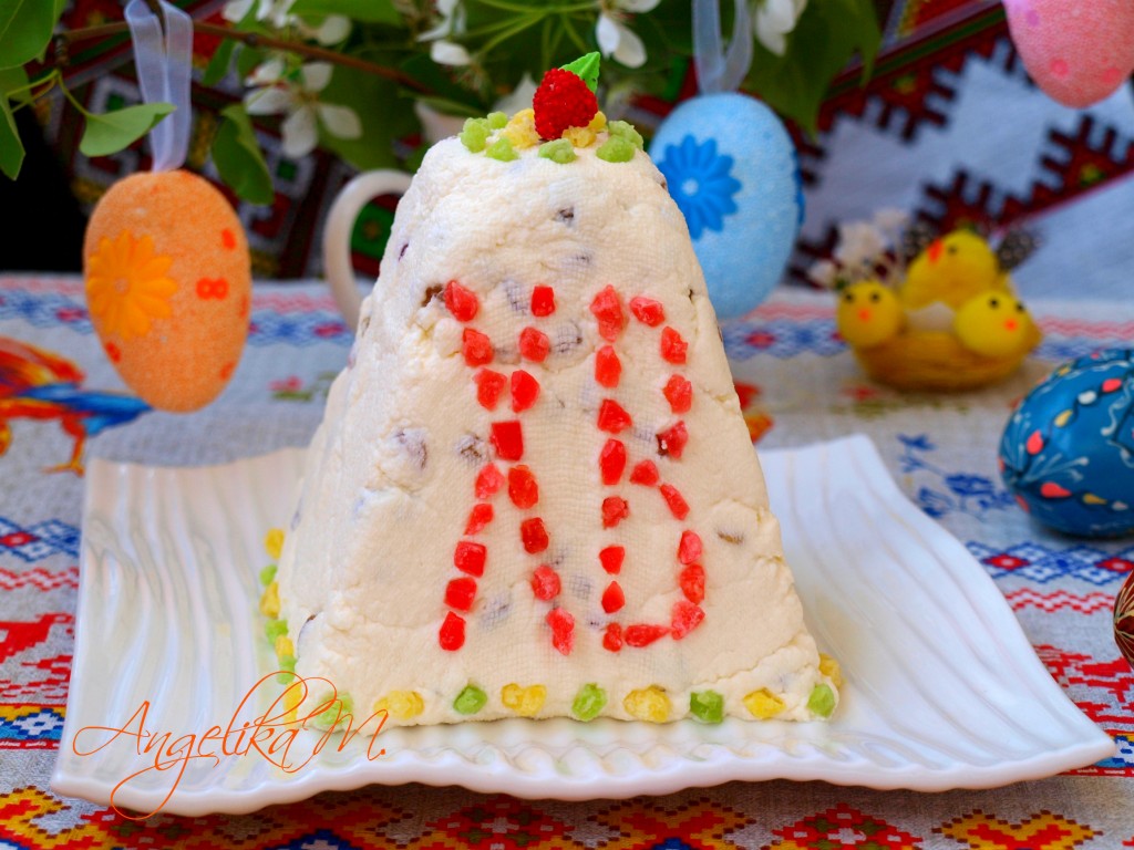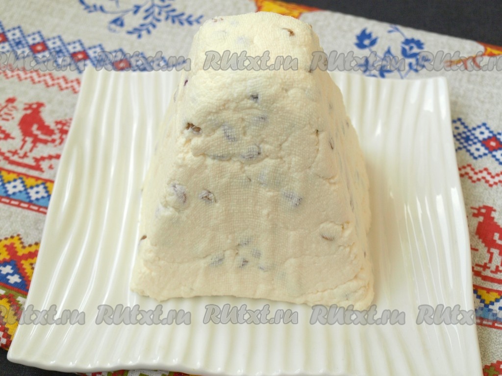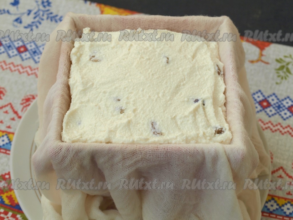 Спустя время банку убрать, перевернуть пасху на тарелку и снять марлю.