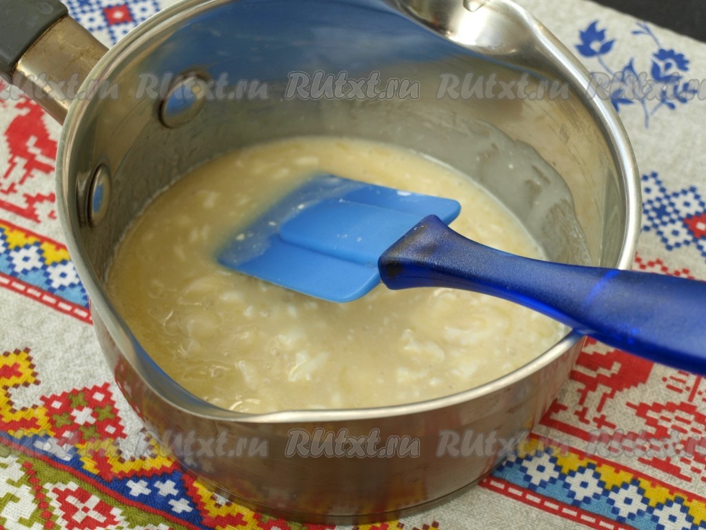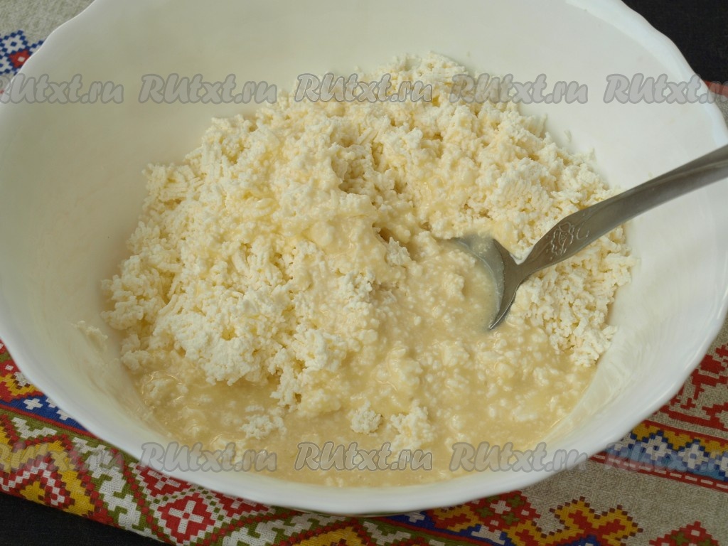 Эту массу добавить к протёртому творогу и хорошо перемешать.