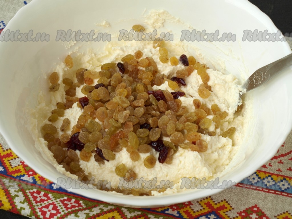 Промыть и обсушить изюм, добавить в творожную массу. Можно использовать и другие сухофрукты на своё усмотрение.