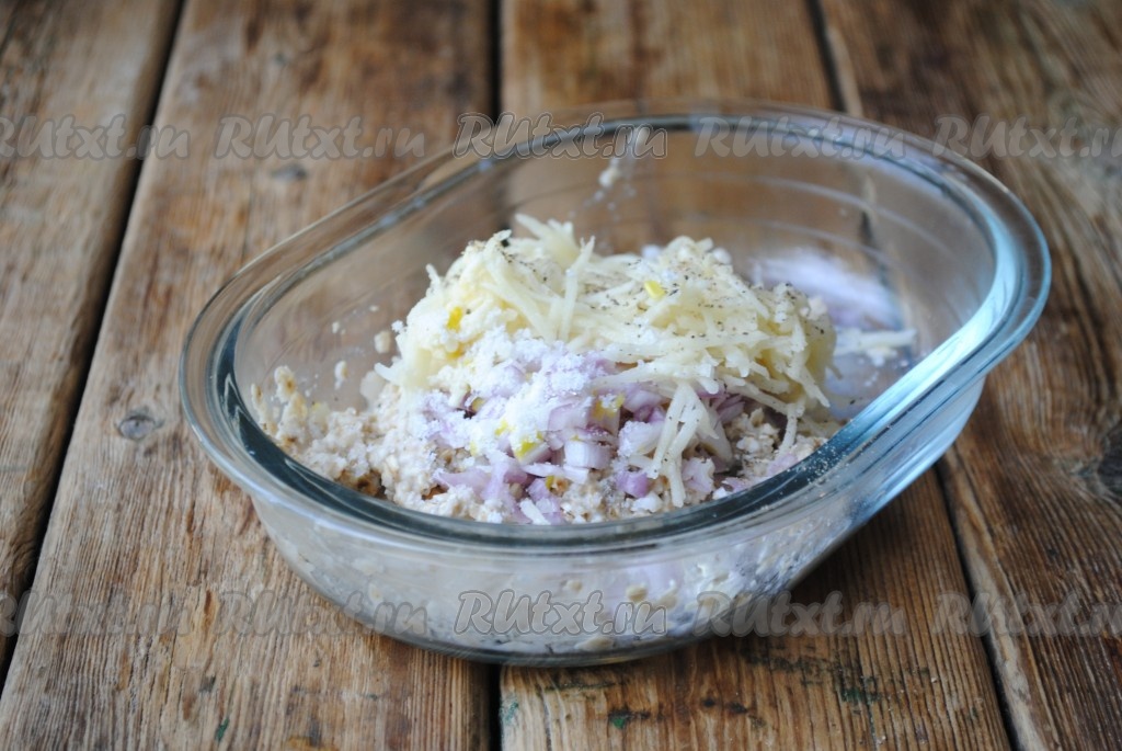 Очищенный картофель натереть на мелкой тёрке. Чеснок очистить, пропустить через пресс или натереть на мелкой тёрке. Картошку и чеснок выложить в миску к овсяным хлопьям и луку, посолить, поперчить по вкусу, хорошо перемешать. Должна получиться однородная, вязкая овсяная масса.