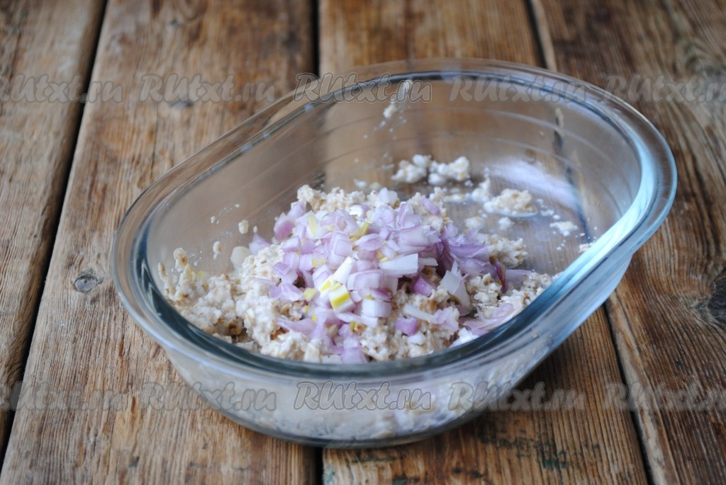 По истечении времени очищенный и мелко нарезанный лук добавить к хлопьям.