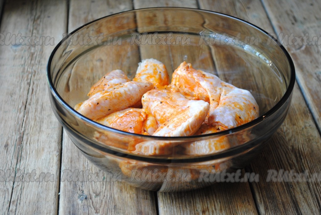Куриные крылья выложить в миску, залить маринадом, перемешать, чтобы каждое крылышко покрылось специями, накрыть крышкой и отправить в холодильник на 2-3 часа.