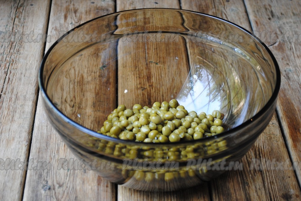 Свежий огурец вымыть, нарезать небольшими кубиками и выложить в миску с горошком.