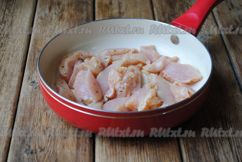 Куриное филе вымыть, обсушить, нарезать полосками, посолить и поперчить по вкусу, выложить на сковороду, разогретую с растительным маслом, и жарить на среднем огне по 5-7 минут с каждой стороны.