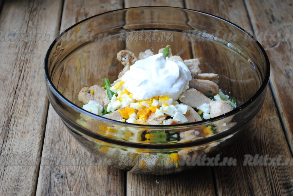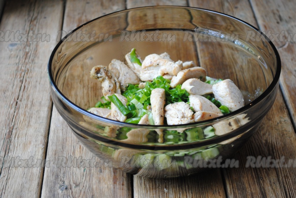 Дать куриному мясу немного остыть и выложить его в салат из горошка, зеленого лука и огурца.