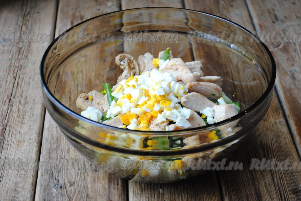 Яйца, сваренные вкрутую, остудить, очистить, нарезать кубиками и отправить в салат.