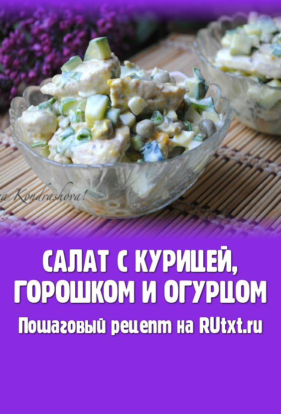 Хочу предложить Вашему вниманию рецепт сытного и вкусного салата с курицей, горошком и огурцом. Продукты, которые используются в этом рецепте, отлично сочетаются между собой. Куриное мясо я жарила на сковороде, по желанию, его можно отварить или запечь в духовке. В качестве заправки я использовала сметану. Получается очень вкусный салат, попробуйте.