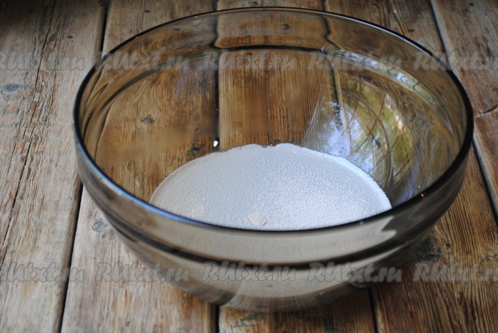 В тёплую воду добавить сахар и дрожжи, перемешать и оставить на 10 минут, чтобы дрожжи "запустились" (на поверхности появится пышная "шапочка").
