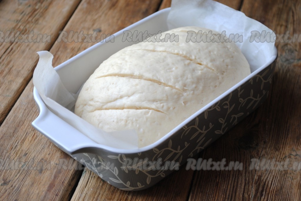 Тесто ещё раз обмять. Форму для выпечки застелить пергаментом или смазать растительным маслом, выложить в форму тесто. Накрыть форму полотенцем и дать заготовке расстояться около 30 минут.