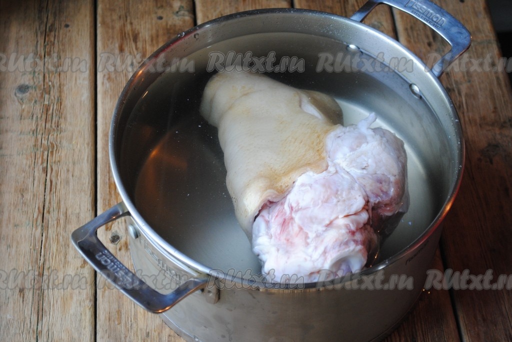 В глубокую кастрюлю выложить рульку и залить её полностью водой. Как только вода закипит, слить ее и залить мясо чистой водой. Опять поставить вариться.