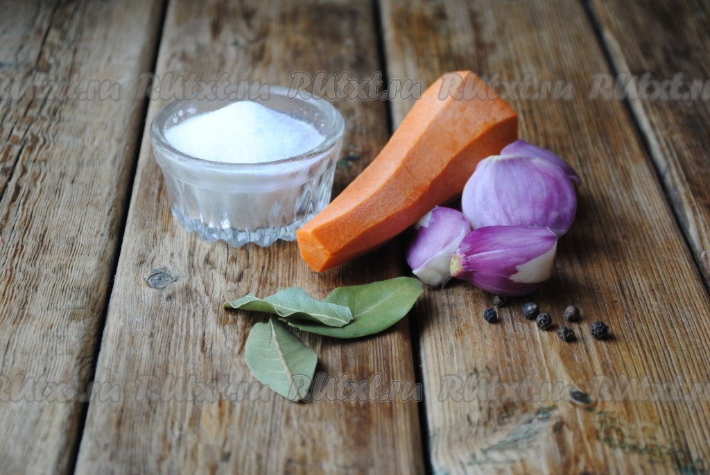 После закипания огонь уменьшить и варить свиную рульку около 2-2,5 часов (время приготовления зависит от веса рульки, варить нужно до тех пор, пока мясо не станет мягким и не начнёт отделяться от кости). После того как рулька проварится 1 час, добавить в воду очищенные лук, морковь, чёрный перец горошком, соль и лавровые листья.