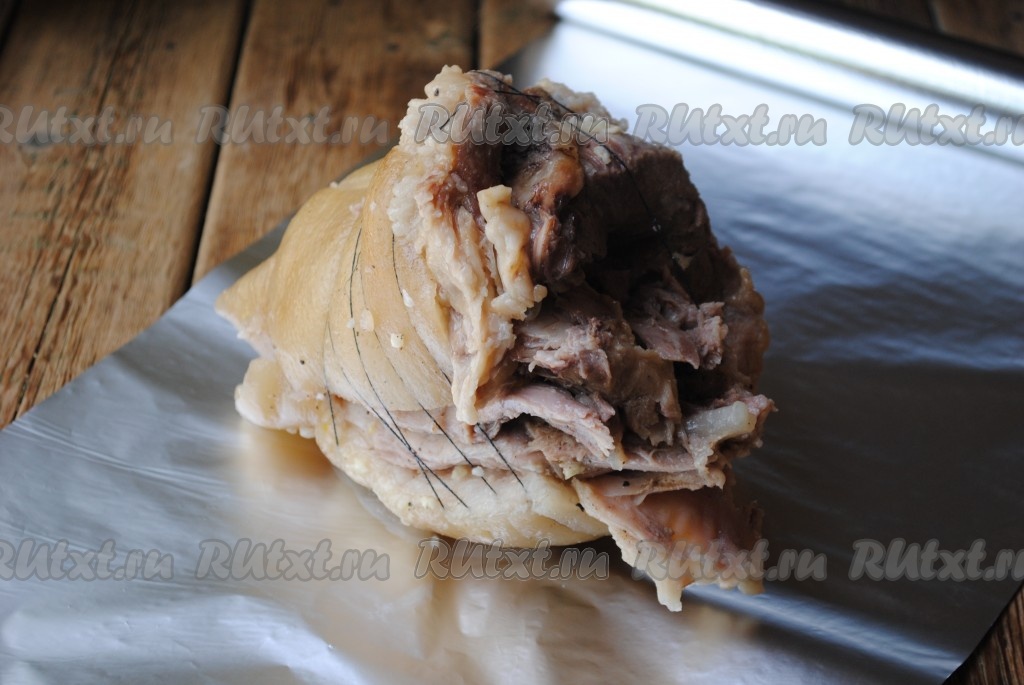 Затем завернуть в фольгу и отправить в холодильник минимум на 1,5 часа, а лучше на ночь. Рулет из вареной свиной рульки должен полностью остыть и пропитаться всеми специями и чесноком.