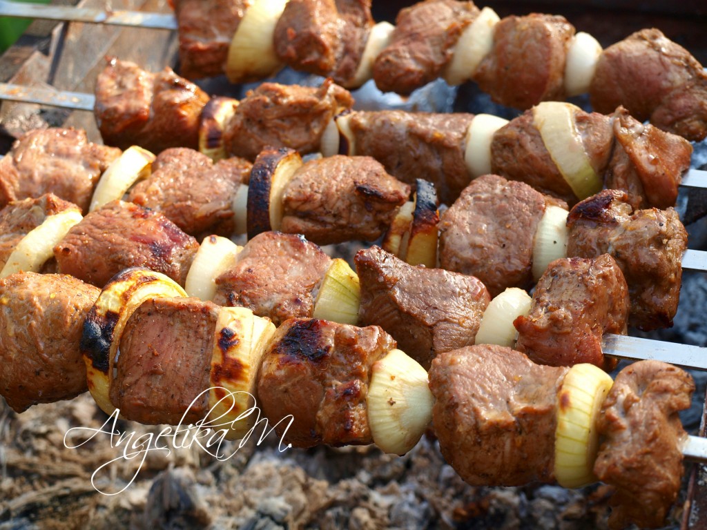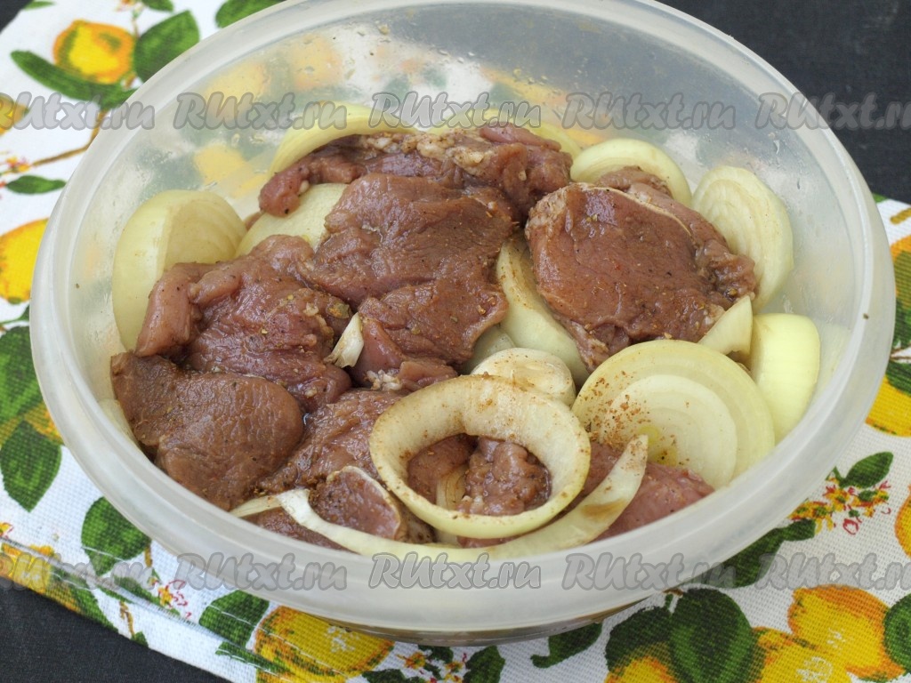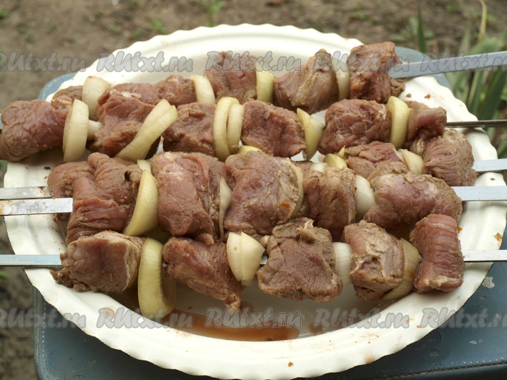 Перед приготовлением мясо посолить, затем нанизать на шампуры, чередуя с луком.