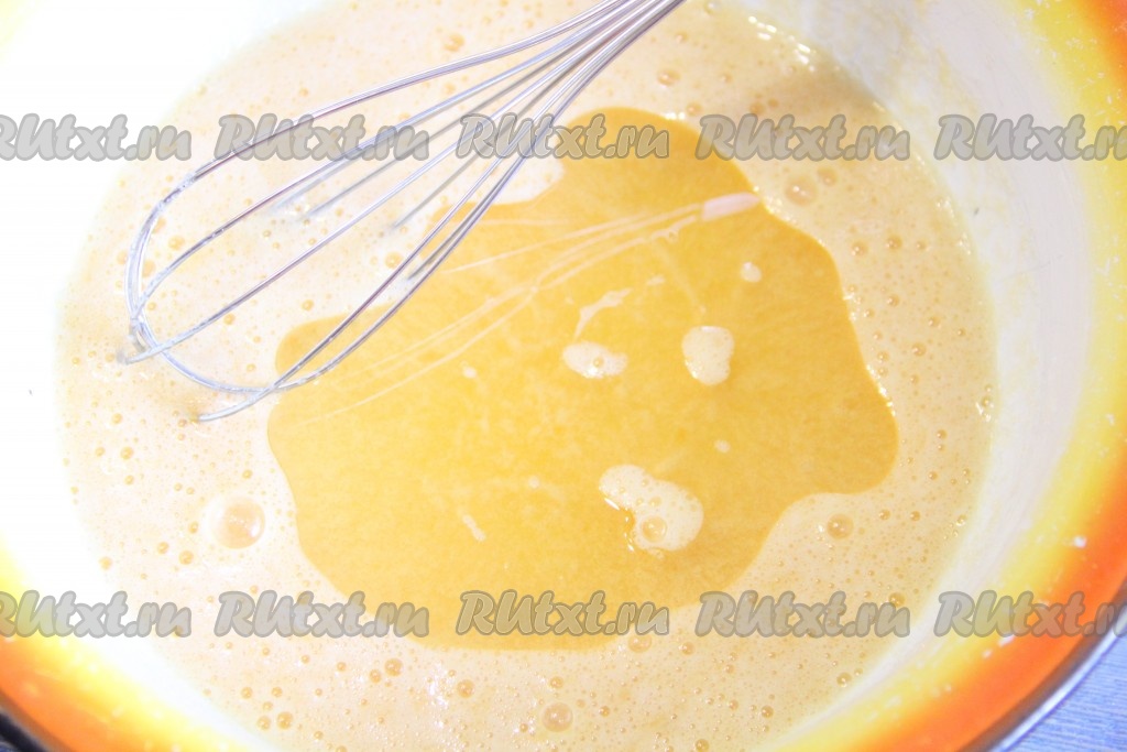 Взбить яйца с сахаром с помощью венчика до однородного состояния. Затем добавить растительное масло.