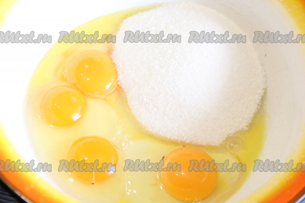В глубокой миске соединить яйца и сахар.