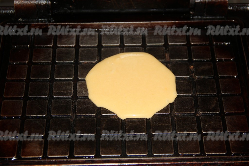Тесто для вафельных корзиночек получится не густым и однородным. Электровафельницу хорошо разогреть. Вылить одну столовую ложку теста на середину вафельницы.