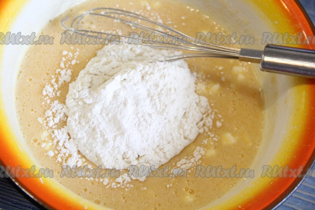 Всё тщательно перемешать, а затем всыпать муку и разрыхлитель.