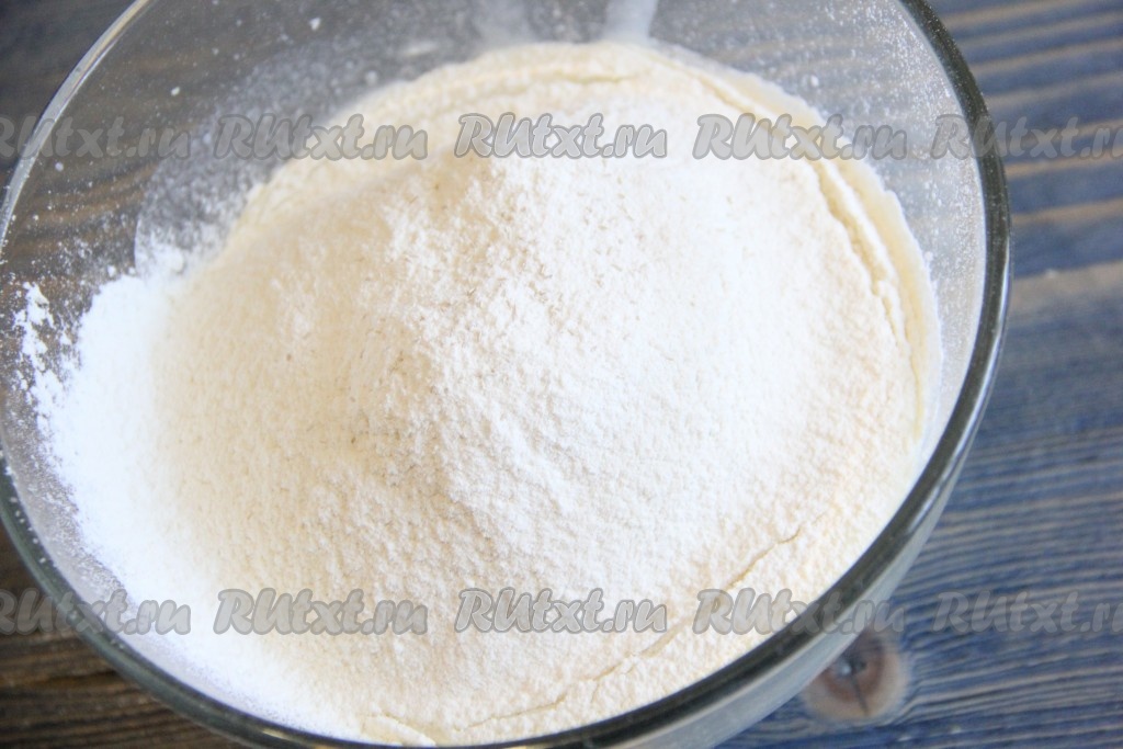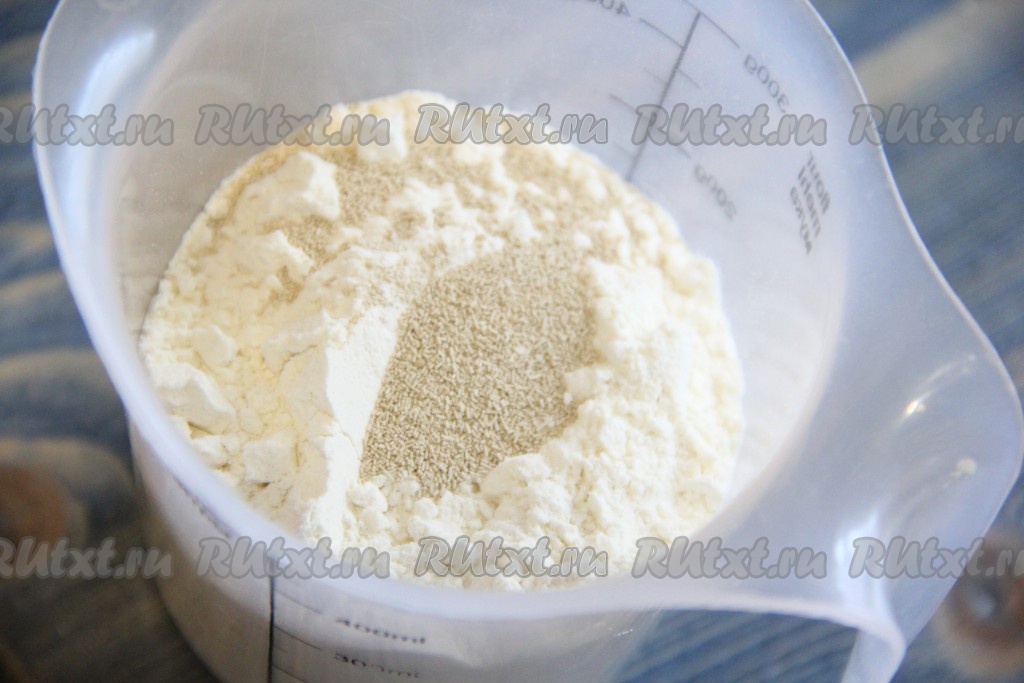 В отдельную ёмкость просеять муку и соединить с сухими дрожжами и солью.
