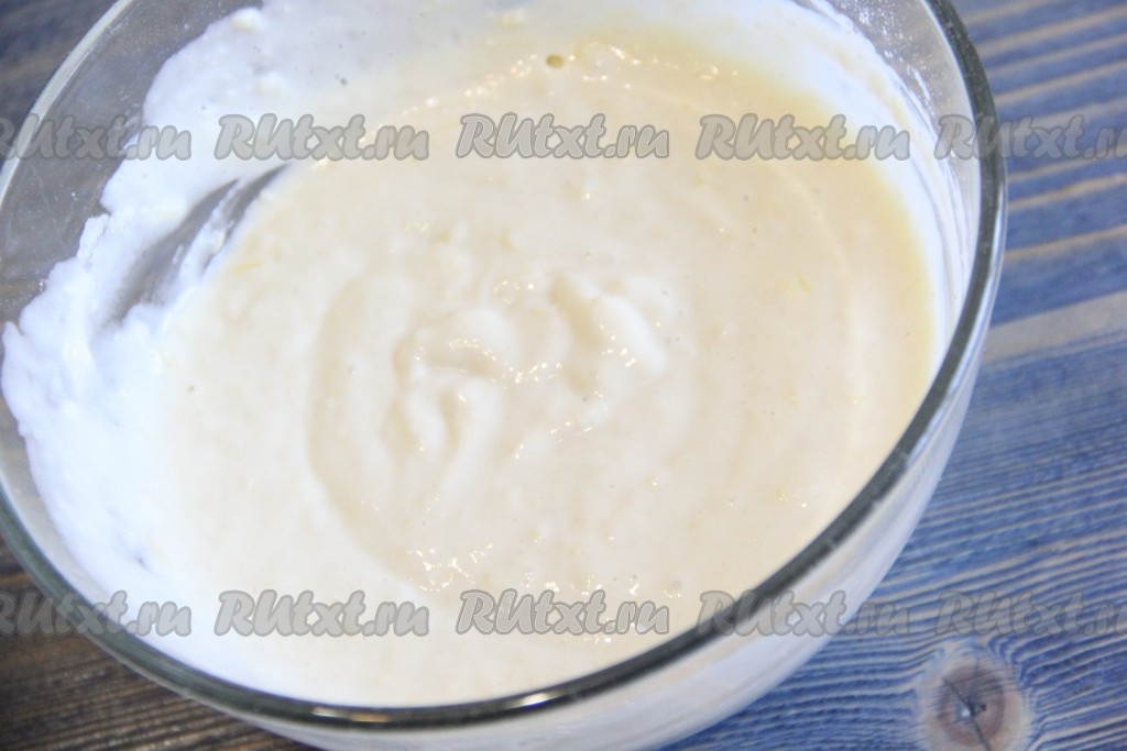 Получившуюся смесь муки и дрожжей всыпать в картофельно-молочную смесь, перемешать тесто для картофельных оладий силиконовой лопаткой или ложкой.