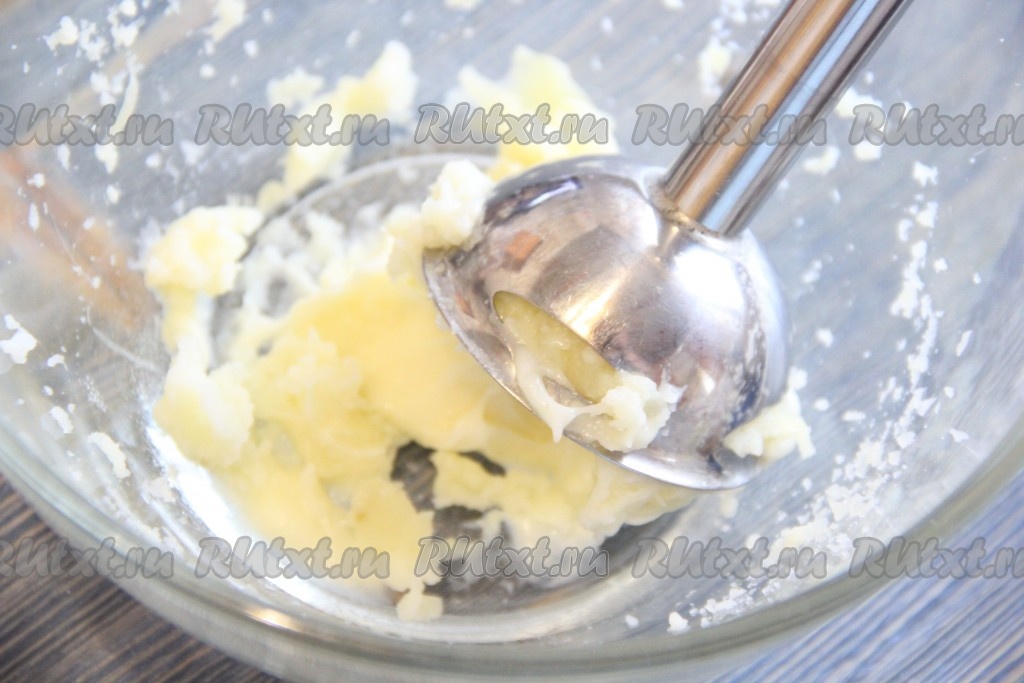 Вареный картофель измельчить погружным блендером в пюре.