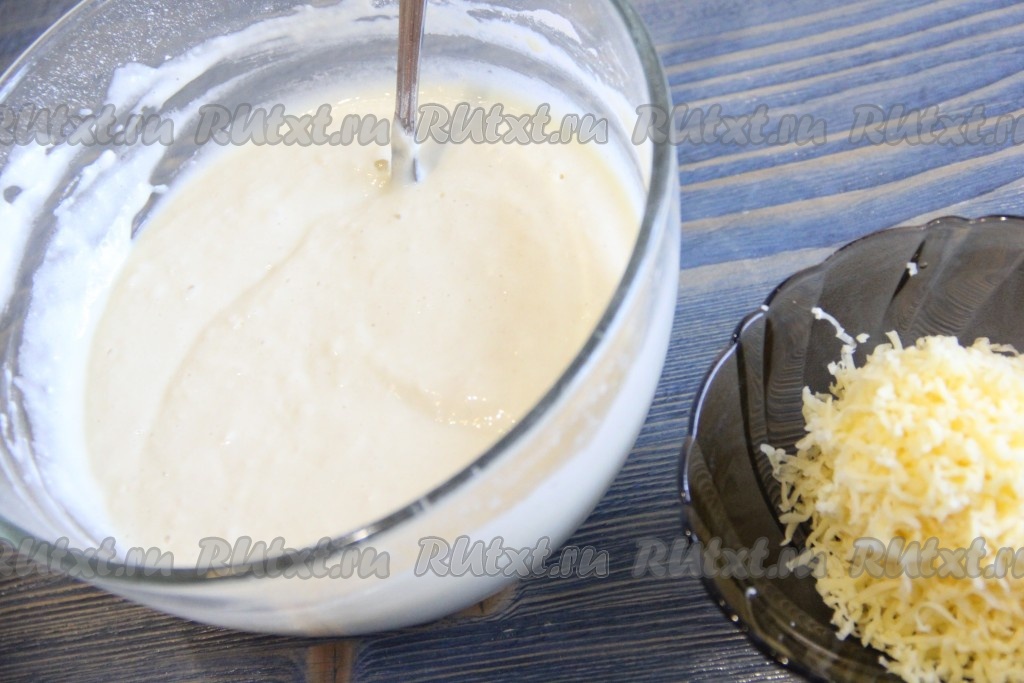 Добавить сыр в тесто и хорошо перемешать. Тесто получится гуще, чем на блины. Накрыть миску с тестом пищевой плёнкой и оставить в тепле на 1 час. Тесто немного поднимется и слегка запузырится.