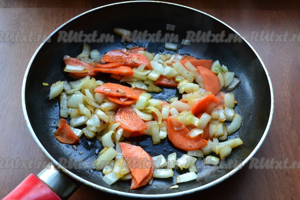 В ту же сковороду влить еще немного растительного масла и выложить нарезанный кубиками репчатый лук и нарезанную тонкими полу кружками морковь, обжарить овощи, иногда помешивая, до мягкости.