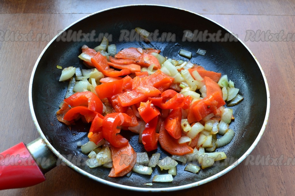 Далее добавить крупно нарезанный консервированный или свежий болгарский перец, перемешать и обжаривать ещё 5 минут, иногда помешивая.