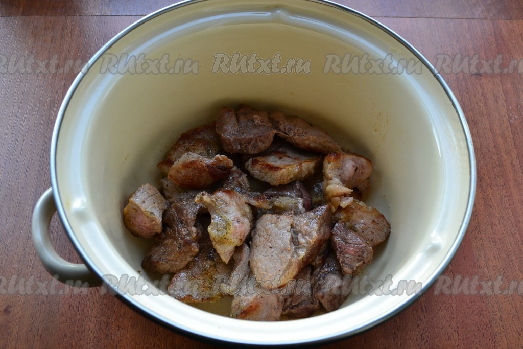 Обжарить свинину на разогретом растительном масле на среднем огне до румяной корочки со всех сторон.