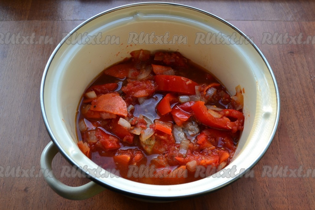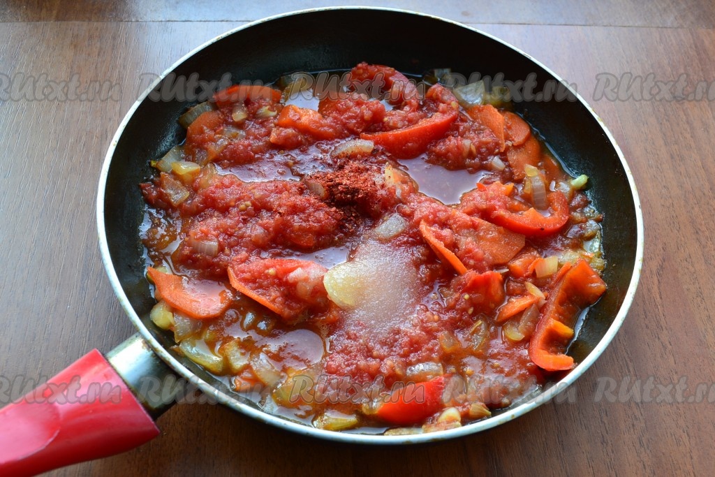 Добавить в сковороду с обжаренными овощами натертые на терке помидоры, соль, сахар и паприку. Влить 150 мл воды, перемешать, тушить овощи на небольшом огне около 7 минут.