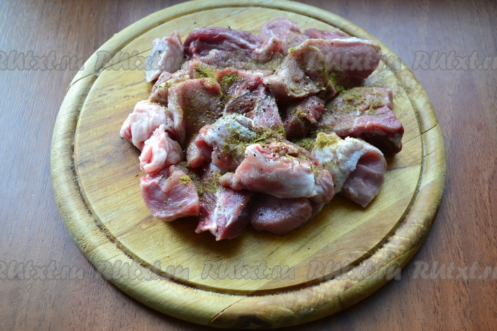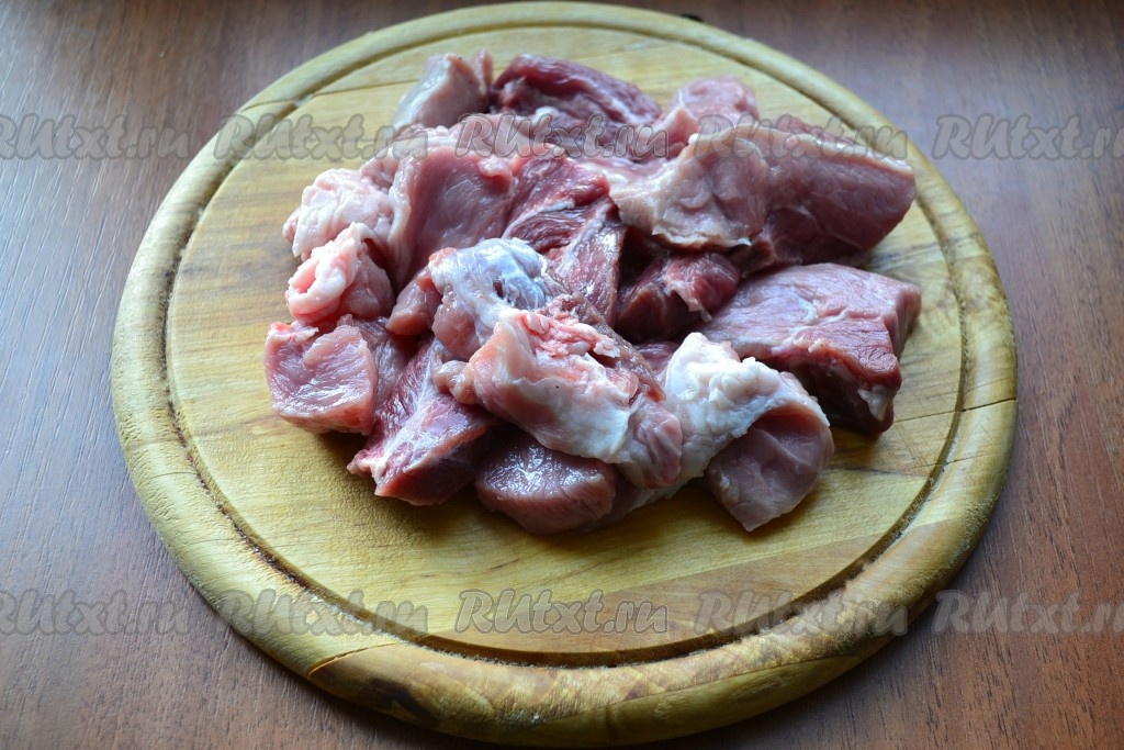 Свинину нарезать довольно крупными, но не толстыми кусками.