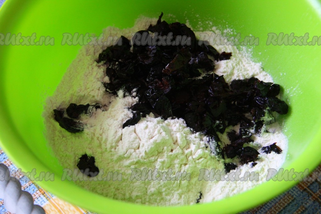 Отдельно соединить муку, нарезанный чернослив, разрыхлитель и соль, перемешать.
