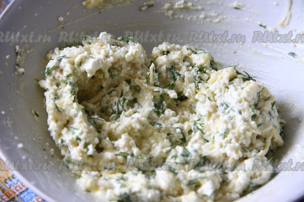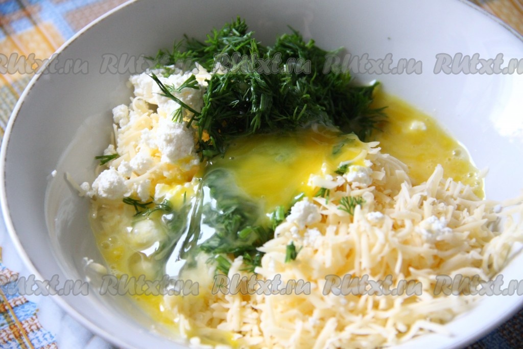 К сыру и творогу добавить слегка взбитое яйцо, пропущенный через пресс чеснок и мелко нарезанную зелень.