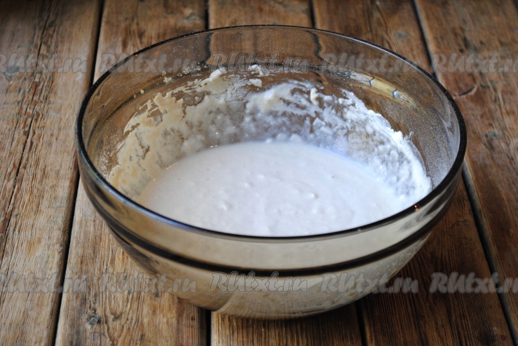 Тесто должно быть похожим на густую сметану. Накрыть миску полотенцем и оставить в тёплом месте на 30 минут.