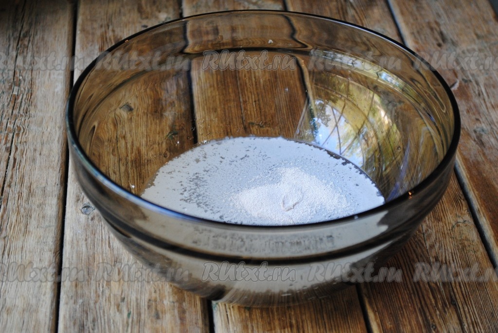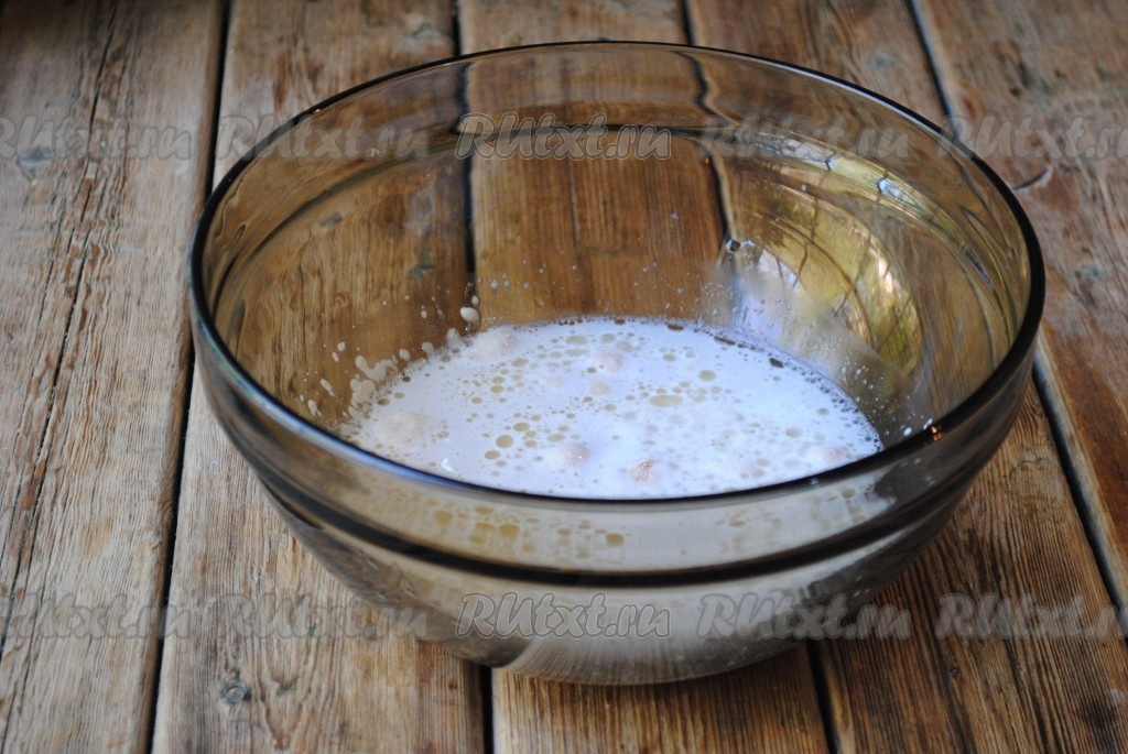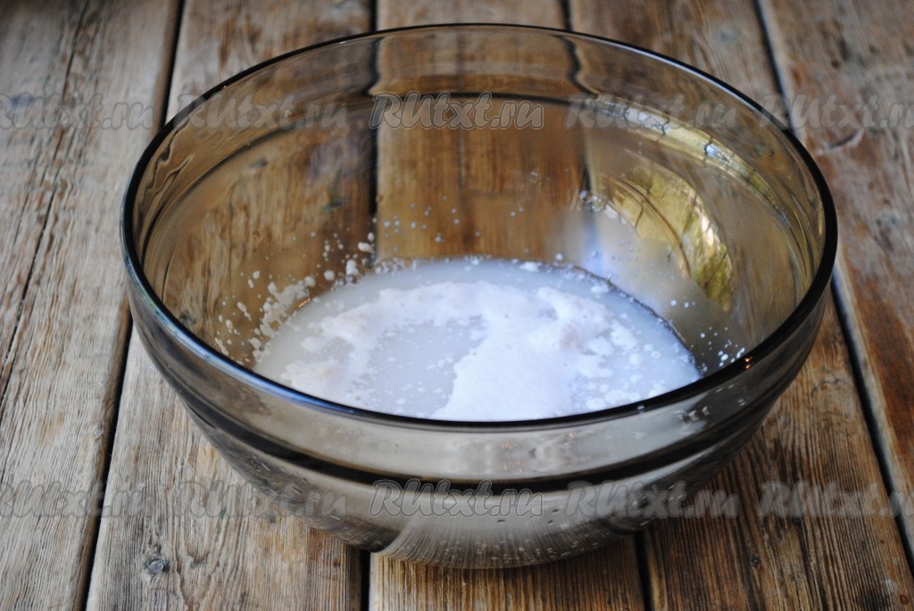 В тёплую воду всыпать сахар и соль, всё хорошо перемешать, чтобы кристаллики растворились. Всыпать дрожжи, перемешать и оставить на 10-15 минут.