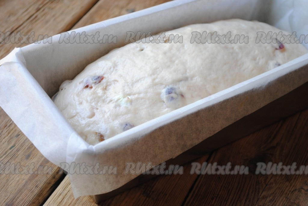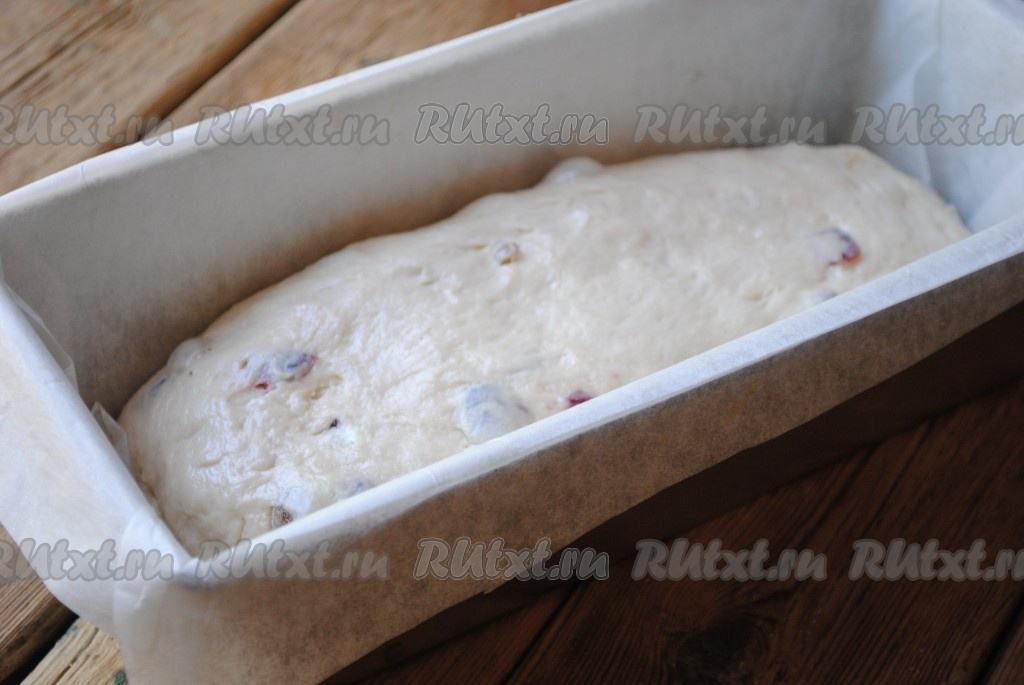Спустя указанное время, тесто обмять. Форму для выпечки застелить пергаментом или смазать растительным маслом, выложить в форму тесто. Накрыть форму полотенцем и дать заготовке постоять около 30 минут. За это время тесто поднимется.