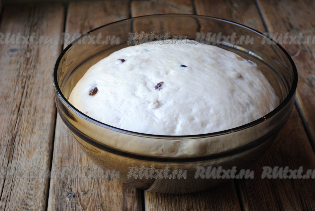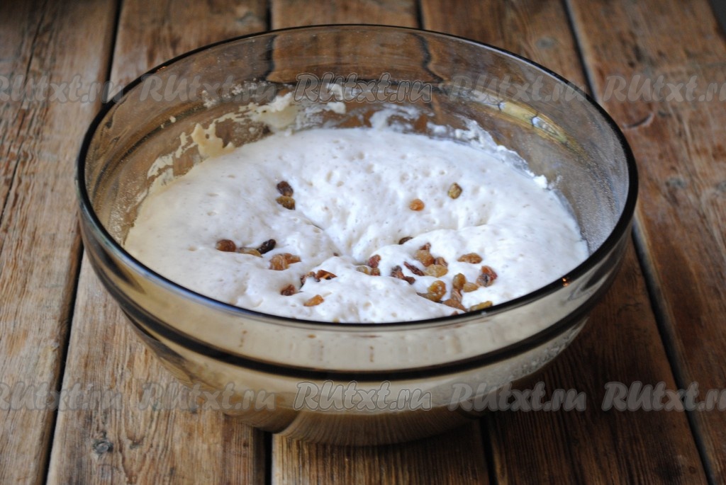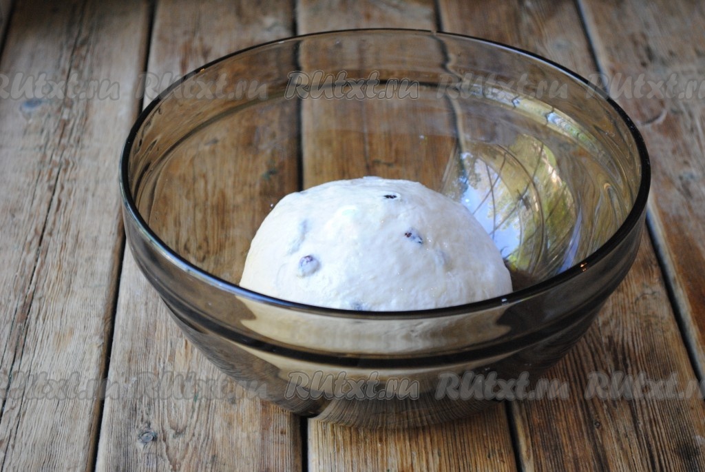 Изюм вымыть и залить на 15 минут горячей водой, затем воду слить, а изюм выложить на полотенце, чтобы он обсох. Когда тесто подойдёт и увеличится в объеме вдвое, добавить подготовленный изюм.