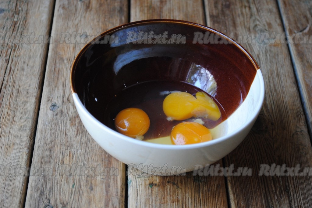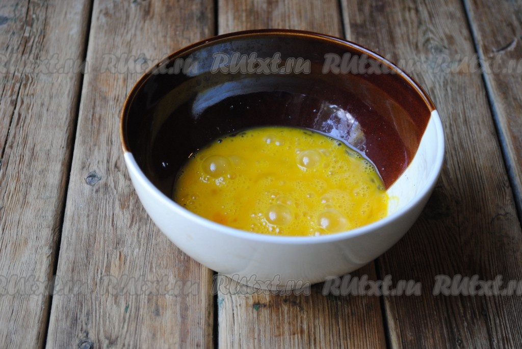 Добавить соль, чёрный молотый перец и молоко, хорошо взбить вилкой до однородной массы.