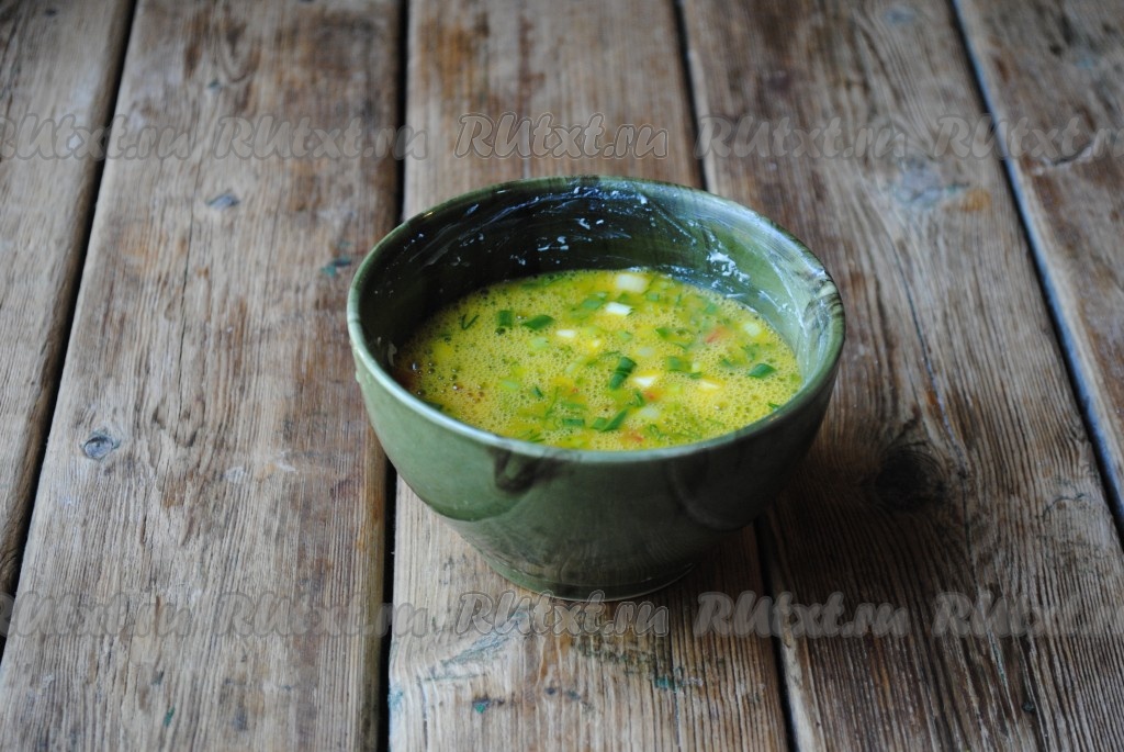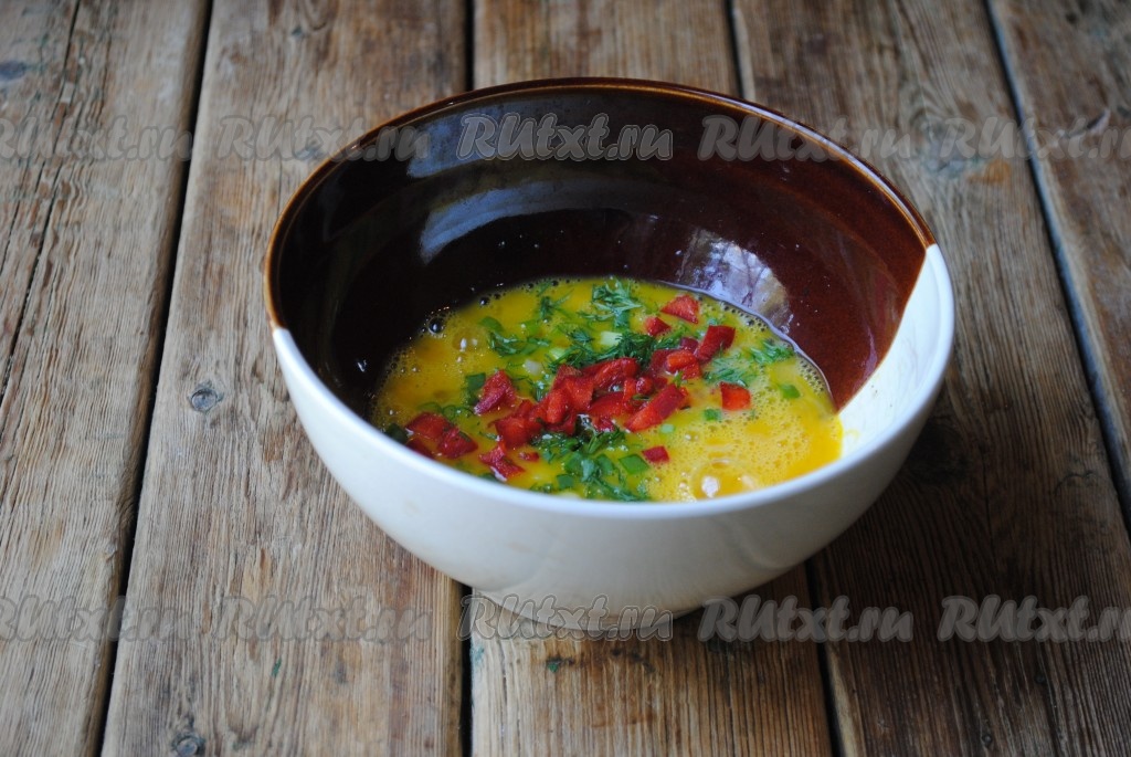 Сладкий болгарский перец нарезать небольшими кубиками. Укроп и лук мелко нарезать. Перец, лук и укроп добавить в яичную смесь, перемешать.