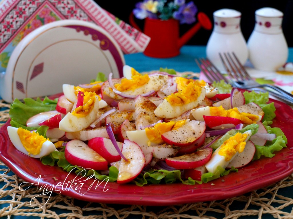 С наступлением тепла хочется употреблять в пищу побольше салатов из свежих овощей. Именно весной самыми актуальными становятся рецепты салатов с редисом и листовым салатом, а добавив в такой салатик яйца, вы получите вполне самостоятельное блюдо. Этот салат с редисом и яйцами особенно понравится тем, кто любит интересное сочетание вкусов и следит за своей фигурой. Немаловажную роль в этом блюде играет очень вкусная заправка на основе оливкового масла, мёда и гранатового соуса.