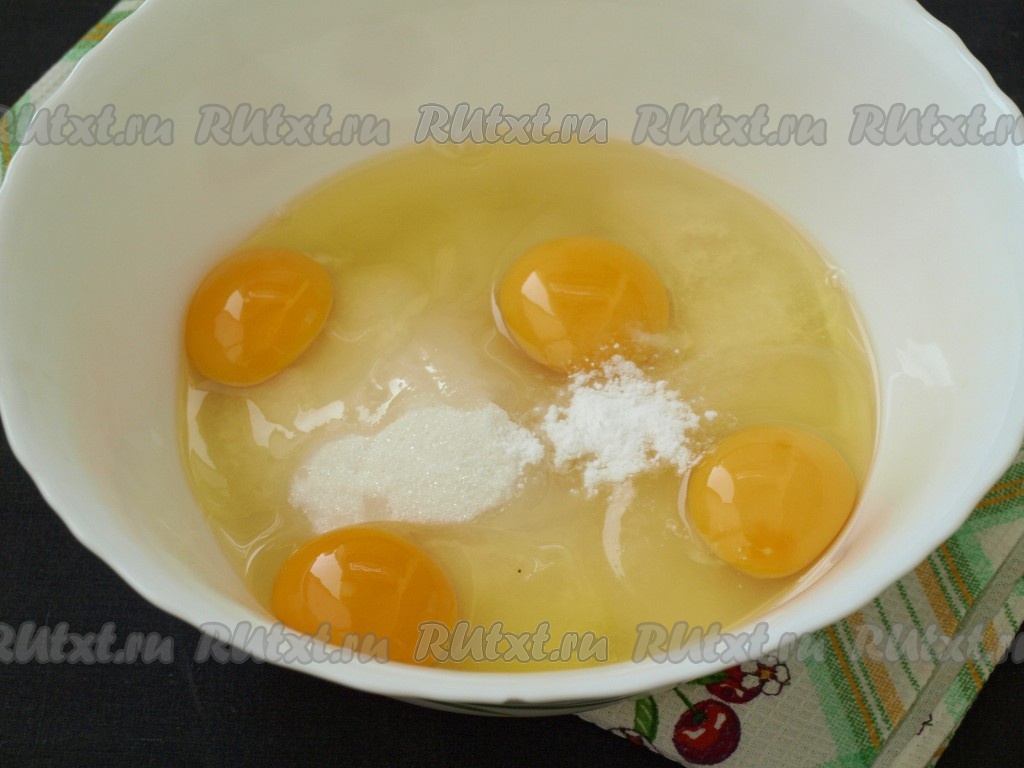 В глубокую миску отмерить сахар и ванилин, разбить яйца и тщательно перемешать при помощи миксера.