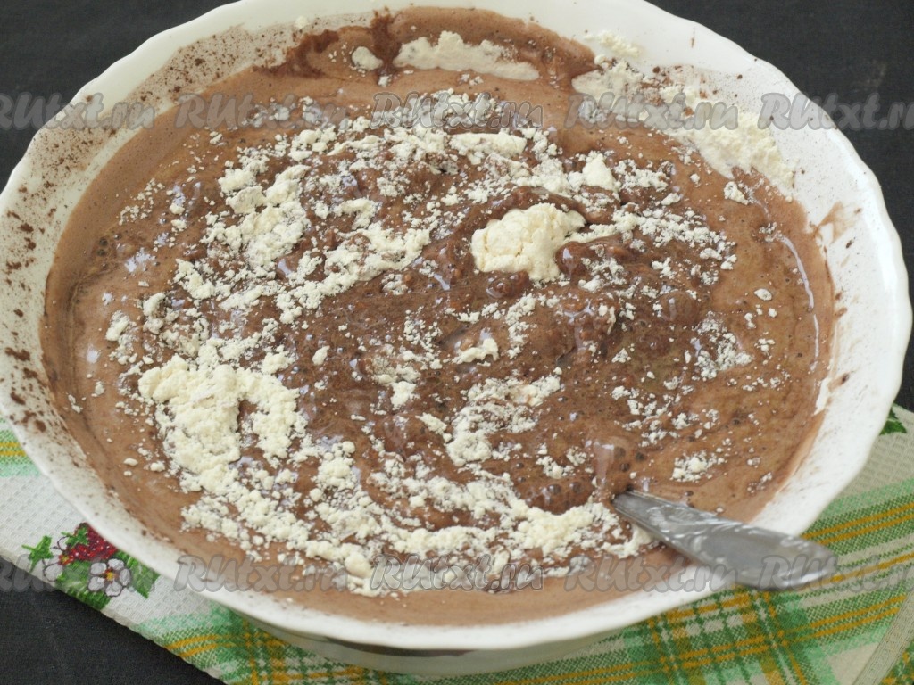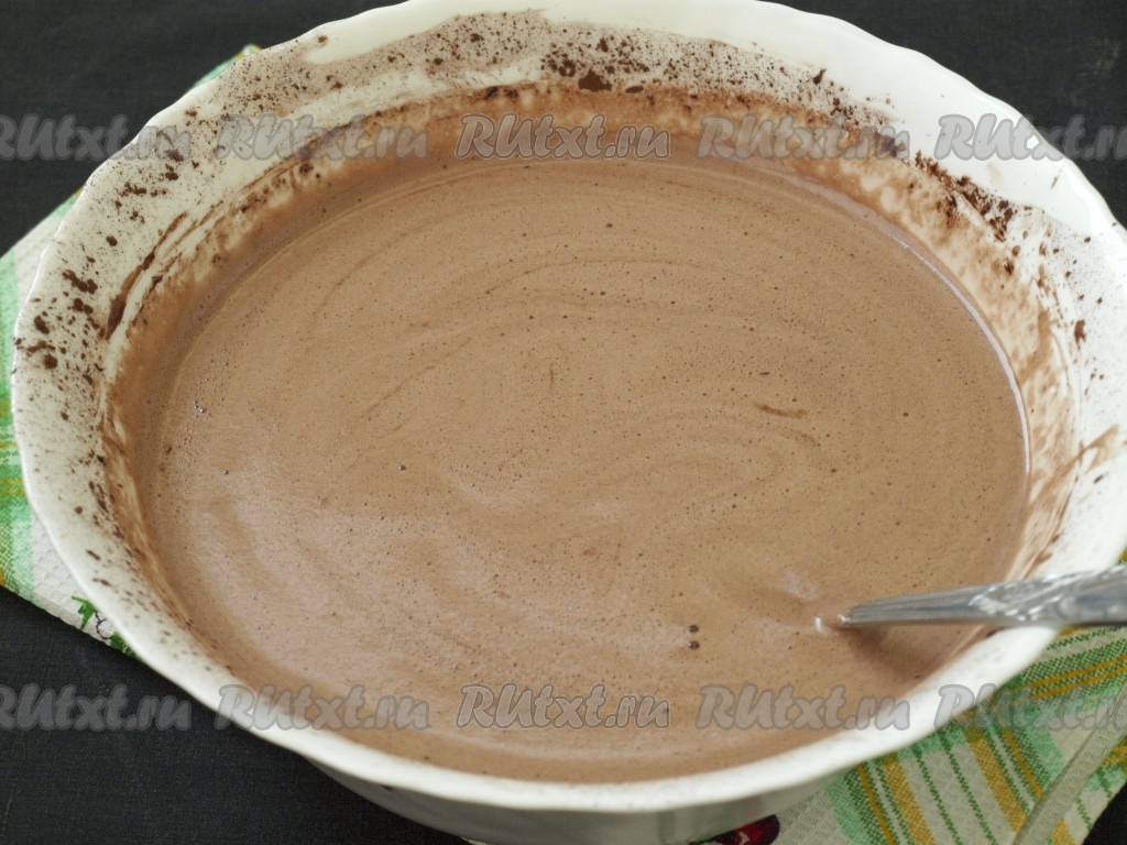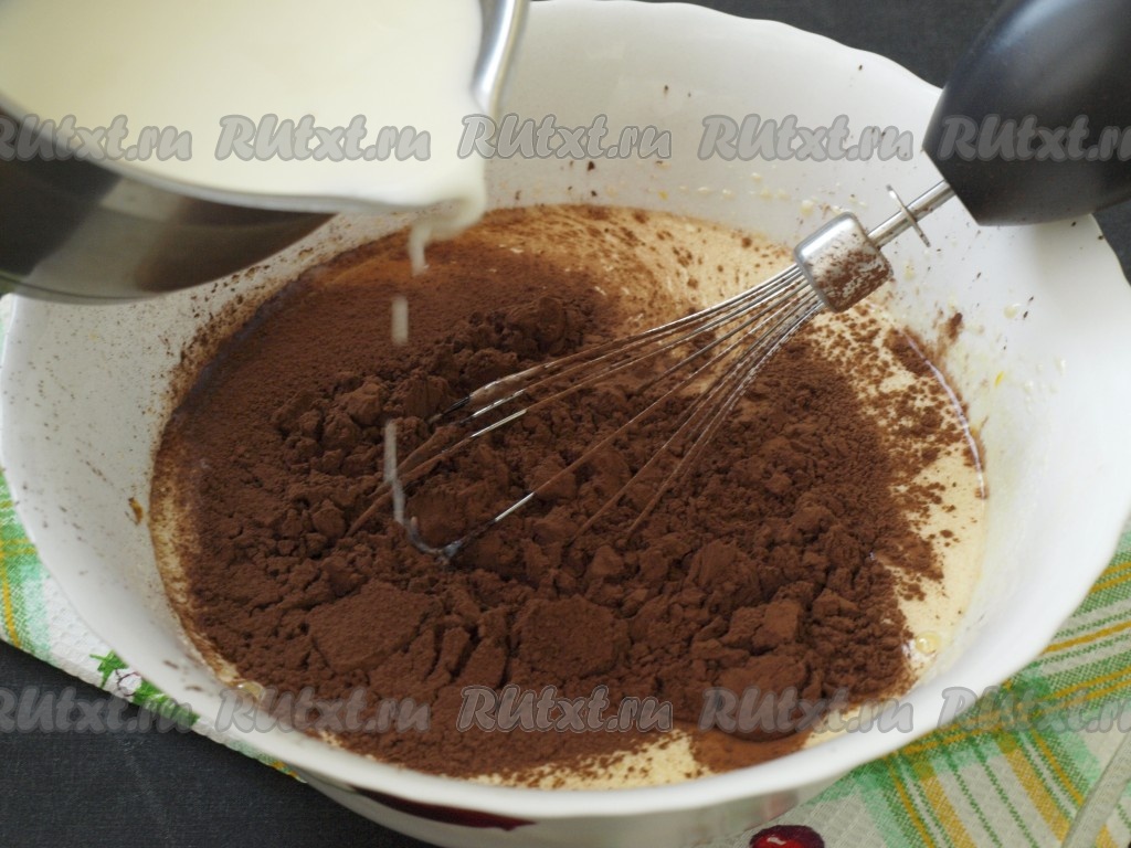 Добавить растительное масло, ещё раз взбить, просеять какао и добавить едва тёплое молоко.