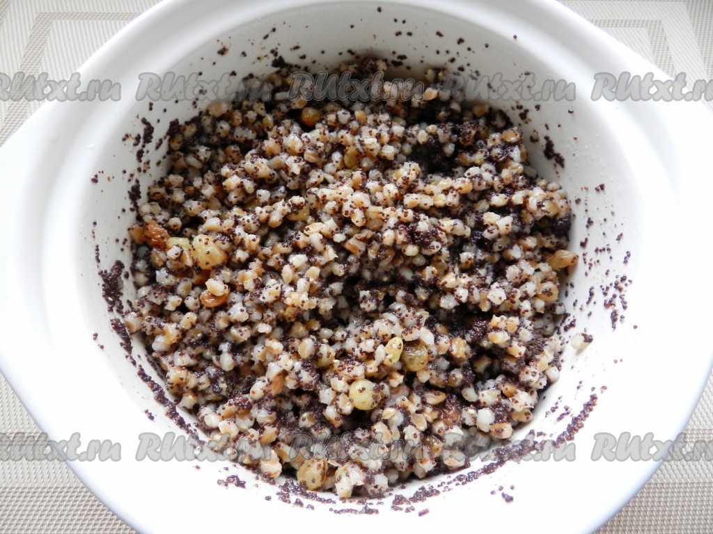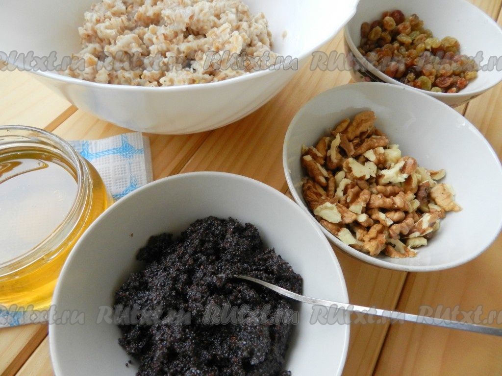 Добавить орехи, изюм и мак.