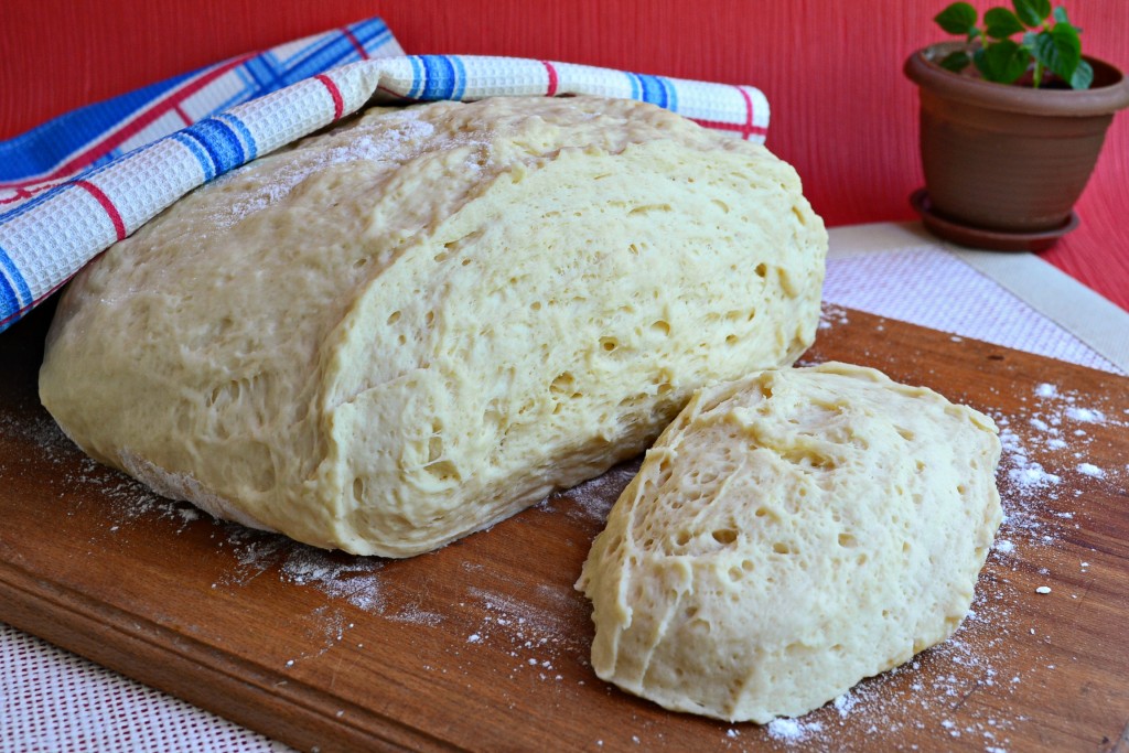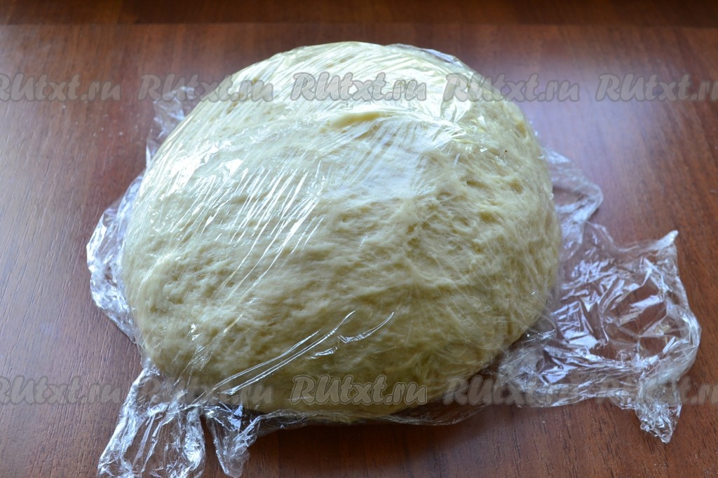 Затем тесто нужно хорошо вымесить, подсыпая оставшиеся 100 грамм муки. Тесто оставить на столе, накрыв пленкой на 20-30 минут, еще раз вымесить.
