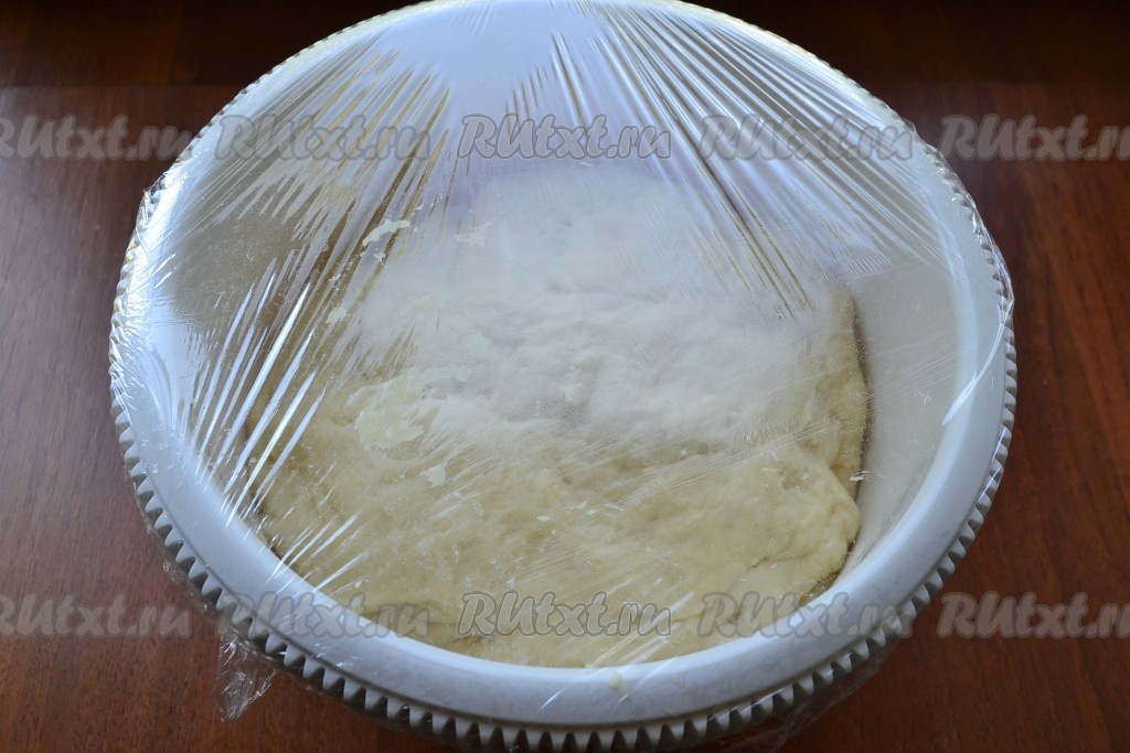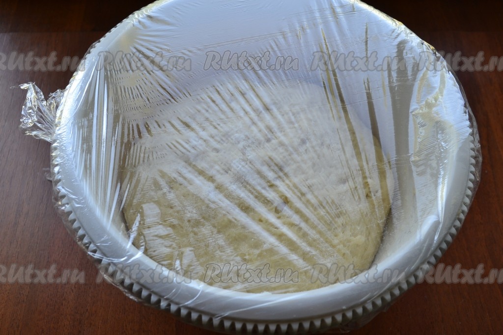Посуду с тестом накрыть пищевой пленкой и оставить в теплом месте на 40-50 минут.