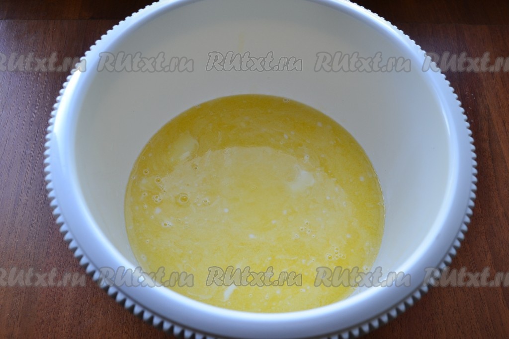 Смесь масла и молока должна быть теплой. В эту смесь раскрошить свежие дрожжи, всыпать сахар, ванильный сахар и соль. Размешать до растворения сахара и дрожжей.