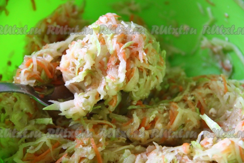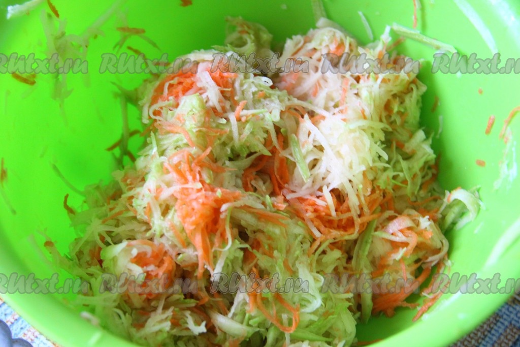 Натереть картошку, кабачок и морковку на средней тёрке, выложить в миску и отжать от лишней жидкости.
